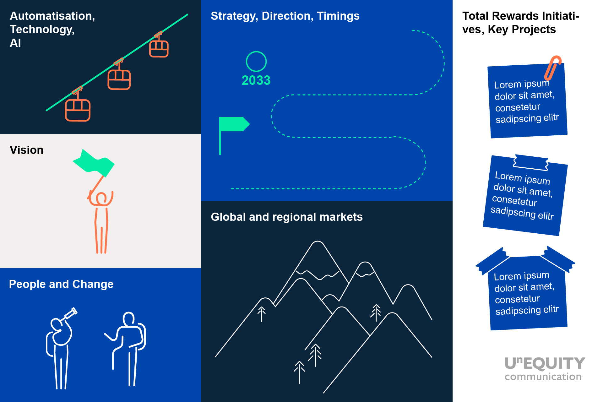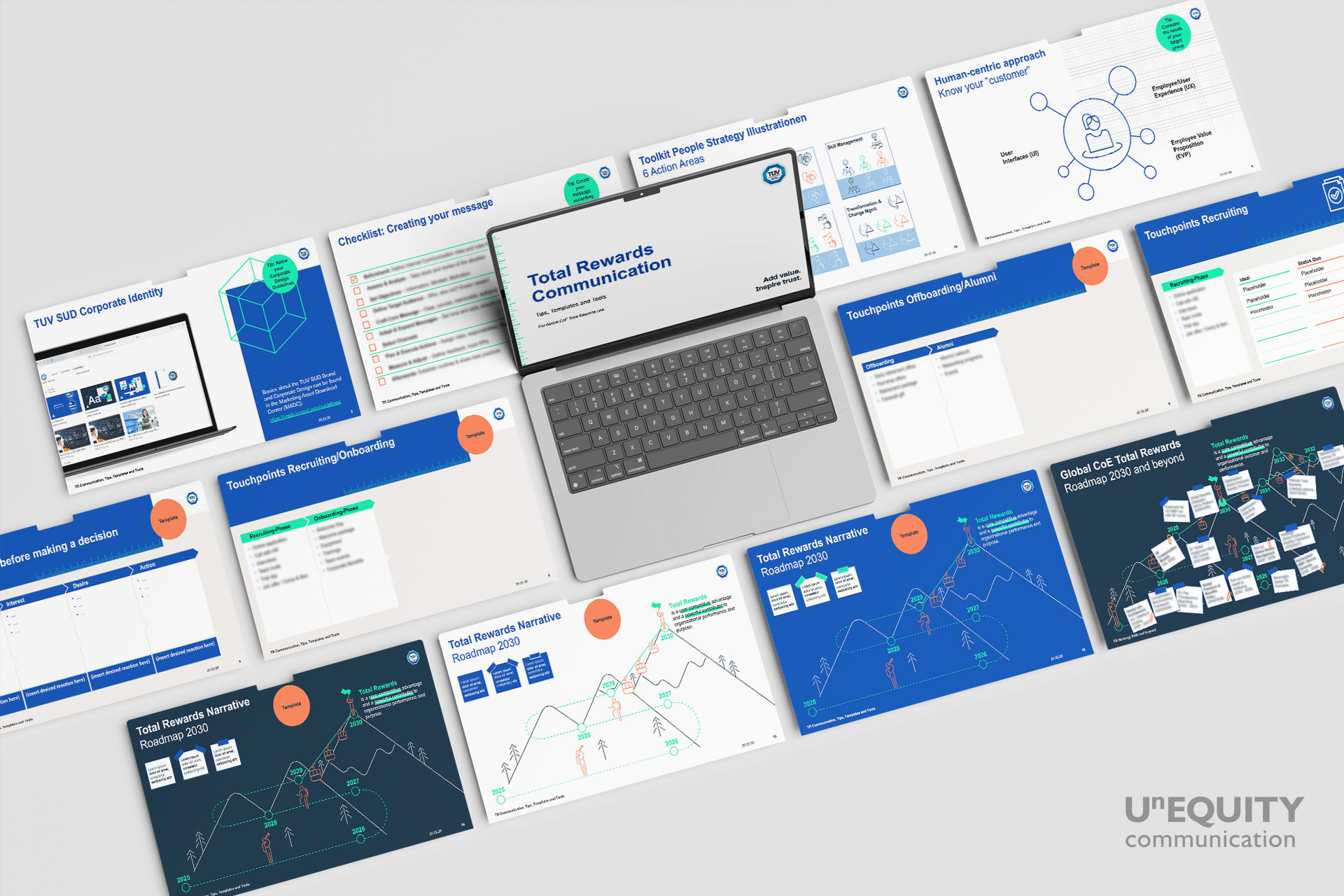 Mit einprägsamen Narrativen und Botschaften, visuellem Storytelling und verständlichen Infografiken unterstützten wir die interne Kommunikation der neuen Total Rewards Strategie an verschiedene Stakeholder und Zielgruppen innerhalb TÜV SÜD. Ein Kommunikationstraining für die globalen Topic Owner während eines mehrtägigen Offsite-Workshops gehörten zur Befähigung genauso dazu, wie ein Präsentationsdeck mit Vorlagen und leicht zu verwendenden Design-Elementen, ein Glossar mit der Erläuterung wichtiger Fachbegriffe für einen möglichst einheitlichen Sprachgebrauch und ein paar Tipps zur Anwendung im Projektmanagement von Total Rewards Projekten und Initiativen. Natürlich alles basierend auf der TÜV SÜD Corporate Identity – aber mit einem Schuss Extra-Kreativität für die garantierte Aufmerksamkeit und Wiedererkennung.